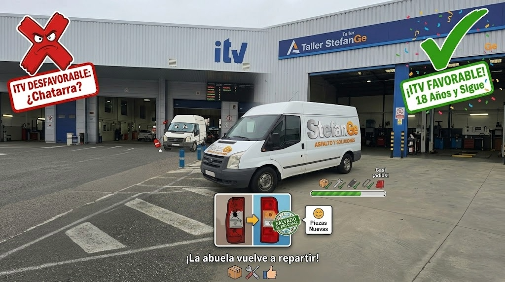 Se la compramos a un repartidor que se jubiló y, desde entonces, es nuestra mano derecha para el asfalto. Pero claro, a sus años, la ITV le tiene manía... ¡Y nos la echaron atrás por "cuatro tonterías" que había que solucionar! 📄❌